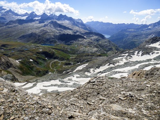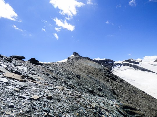 Soon you will rise above the boundary of grass and it is between the rocks and stones searching for the stonemasons that point you in the right direction. After about 3 hours of ascent you get closer to the glacier and arrive at the Col du Basei. From the Col you can see the snow-white glacier glistening in the sun and probably some climbers defying it. They climb up from another valley. On the Col du Basei it can be quite windy, so after a short stop it starts climbing to the top. Punta Basei is a kind of cockscomb with a lot of loose little stones, pay attention here! About 10 to 15 meters below the top you will find large rocks (the cockscomb) in which an iron cable and staples have been hammered. Tricky for small children, but with the right guidance perfectly possible.