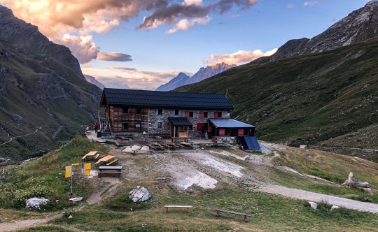 In the parking lot quickly swapped sneakers for my Hanwag Lhasa's and the unmissable mountain path at the end of the road. The Rifugio Benevolo mountain hut is a 1.5 hour walk from the parking lot. It is a beautiful walk along waterfalls, streams and marmots. From about half an hour walk you get a view of the Granta Parey and there are only mountains around you. The last part to the hut is a steep climb (but you can also walk out of the paved hairpin bend) and then you will be rewarded with a beautiful view. From the hut you look left at the glacier behind the Punta Basei and right on the flank of the Granta Parey.
