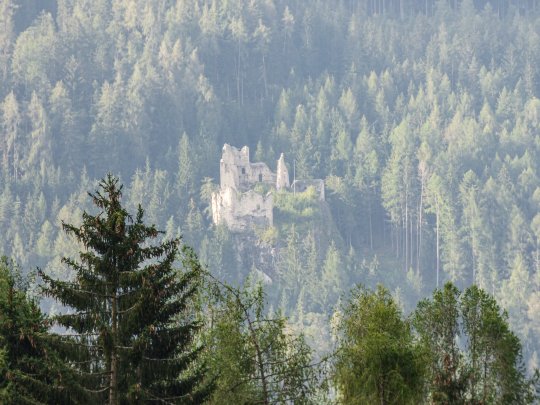 This is really a children's walk. Route no. 3. Starts with a few signs explaining a treasure hunt game for children. They have to search the forest for animals carved in the wood. On the way you'll also pass all information-mushrooms with fun facts about knights and the Middle Ages. In this way the tension builds up towards the castles. After about half an hour walk you arrive at the first castle: Rov. Di Hauenstein. There are still quite a few walls and stairs, and the view of the valley is beautiful. We have lunch here on a castle bench and then continue our way. The second castle is Salego Castle. However, before we arrive here we see an enormous rock, about 30 meters above the footpath. We walk to it and see an arrangement of knight's chairs under the rock, with a big iron book full of adventure stories on a stone block. Salego Castle is a bit less than the first castle, actually just a ruin. Still, it's special to realize that this has been there for about 800 years! How many generations of people have lived, ruled, performed their customs and rituals here?